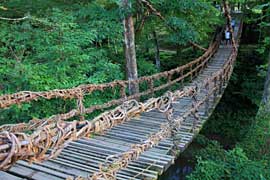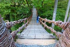 樹木生い茂る足羽川渓谷に架かるカズラのつり橋。
